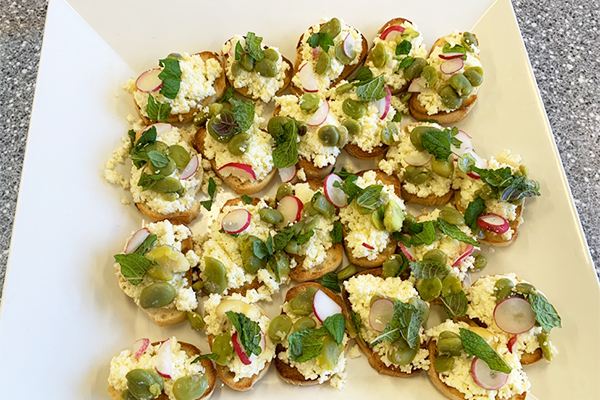 Bruschetta topped with ricotta, broad beans, radish slices and mint made by O'Sullivan Beach School (SA) students